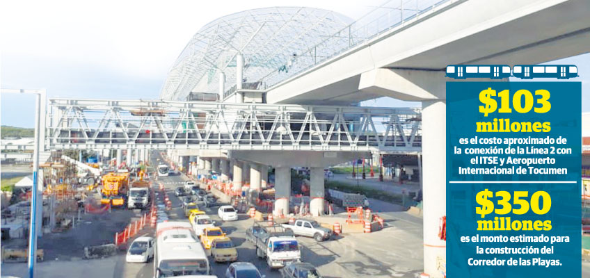 El resto corresponde a la extensión de la Línea 1 del Metro de Panamá a Villa Zaíta ($323 millones), conexión de la línea 2 con el Instituto Técnico Superior del Este (Itse) y el Aeropuerto Internacional de Tocumen, por el orden de los $103 millones, y la construcción del Corredor de las Playas (tramo Santa Cruz-San Carlos), por un monto estimado de $350 millones.