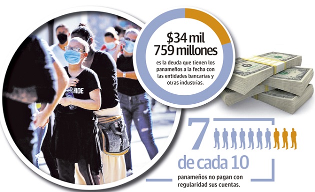 Antes de la crisis esta cifra se mantuvo estable en el 6% de total de las deudas. Pero con el cierre de empresas, la suspensión de casi 300 contratos laborales y la moratoria bancaria, el 70% (7 de cada 10 panameños) no están pagando con regularidad sus cuentas.