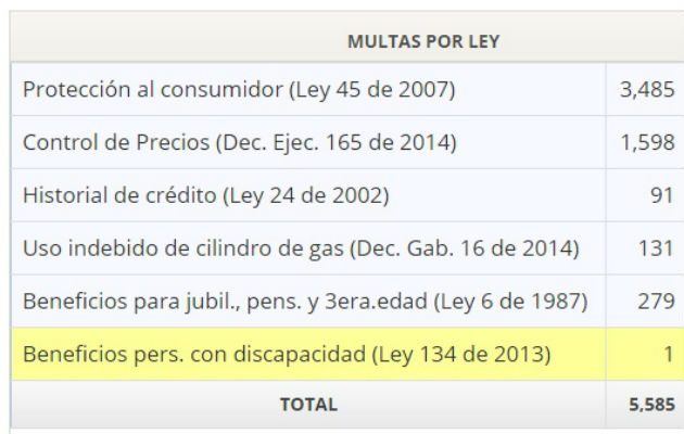 Según datos registrados en el Tablero de Multas, de la página web de esta institución, se han impuesto 3,434 sanciones por infracciones a la Ley 45 de 2007; 1,595 por incumplimiento del control de precios (Decreto Ejecutivo 165 de 2014); 90 irregularidades del historial de crédito (Ley 24 de 2002); 131 por uso indebido del cilindro de gas de 25 libras (Decreto de Gabinete 16 de 2014); 278 casos en contra de los beneficios para jubilados, pensionados y personas de la tercera edad (Ley 6 de 1987) y una irregularidad contra la Ley 134 de 2013 (beneficios para personas con discapacidad).