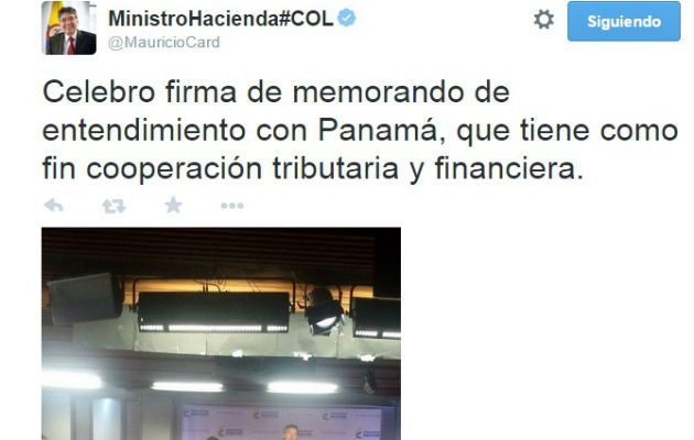 Por su parte, el ministro de Hacienda de Colombia, Mauricio Cárdenas, escribió en Twitter: "Celebro firma de memorando de entendimiento con Panamá, que tiene como fin cooperación tributaría y financiera".