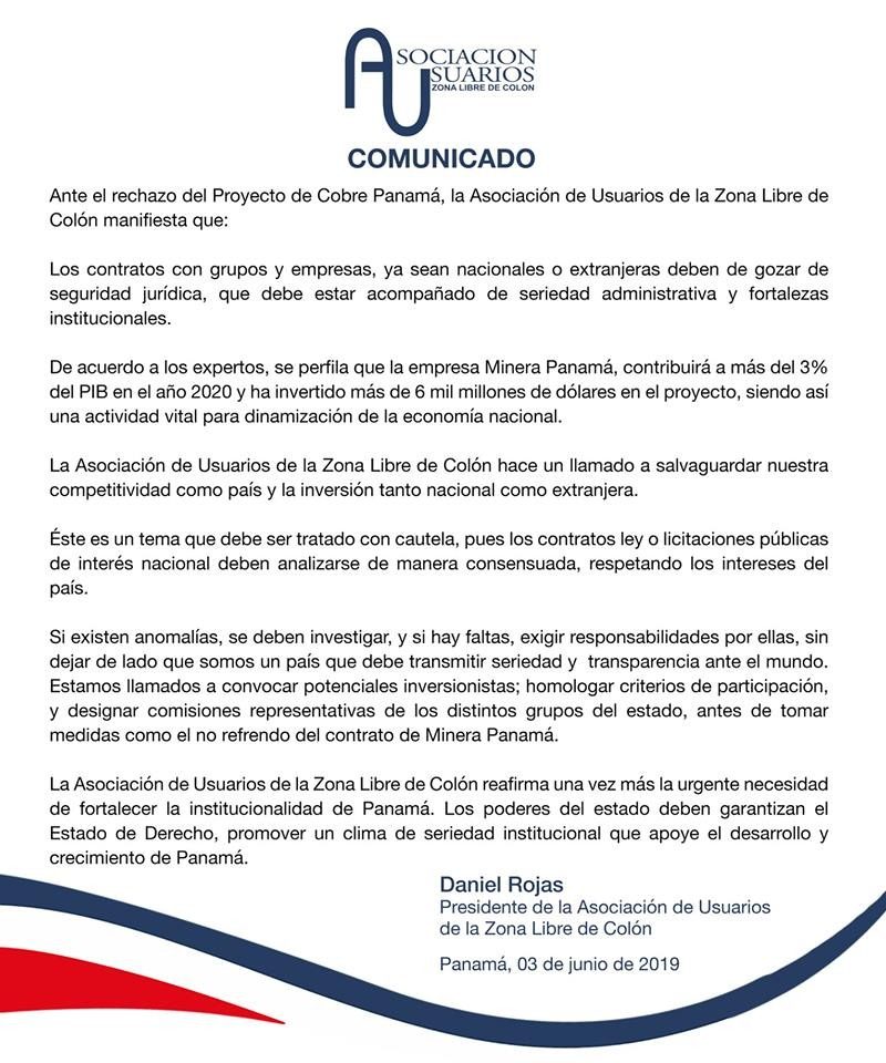 Hasta el momento Minera Panamá ha hecho una inversión de 6 mil millones de dólares y se estima que aporte 3% al producto interno bruto del país en el 2020.