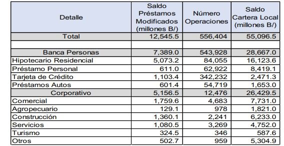 Un comunicado de la Superintendencia de Bancos de Panamá señaló que las modificaciones de la cartera se han realizado especialmente en las operaciones de banca de personas, en particular en la cartera hipotecaria residencial, tarjetas de crédito y préstamos personales que mantienen los clientes en el sistema.
