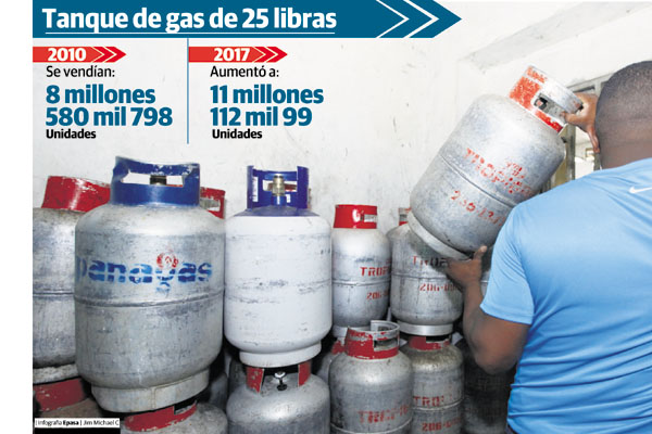 Hace ocho años, en Panamá se vendían 8 millones 580 mil 798 tanques de gas de 25 libras, no obstante, esta cifra aumentó el año pasado a 11 millones 112 mil 99 tanques. Todo lo contrario sucede con el tanque de gas de 60 libras, que pasó de 19 mil 683 tanques de gas en el 2010 a 17 mil 800 unidades en el 2017.
