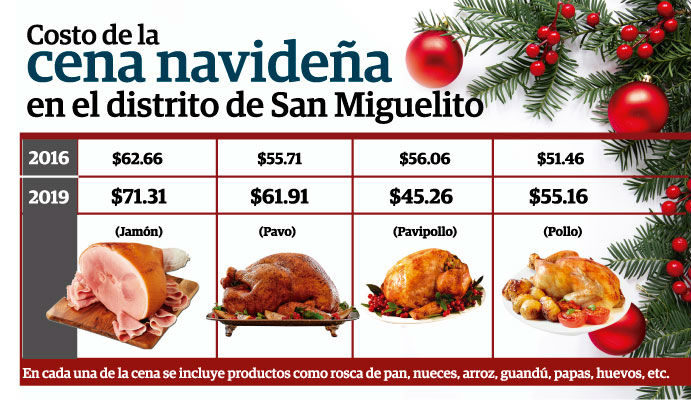 Tres años después, es decir en el 2019, el costo de cada una de las cenas navideñas compuesta por los mismos 20 productos subió de precio notablemente. Por ejemplo, la de pollo está ahora en $55.16, la de pavo tiene un costo de $61.91, la de jamón es de $71.31.