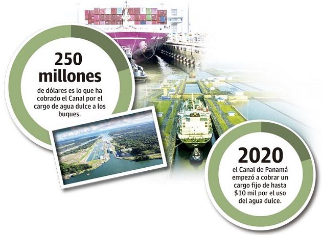 El Canal de Panamá comenzó en febrero de 2020 a cobrar un cargo fijo de hasta $10 mil por el uso del agua dulce y otro variable de entre 1 % y 10 % del peaje, para enfrentar la escasez del líquido derivada de la crisis climática y financiar planes futuros para garantizar su plena disposición.