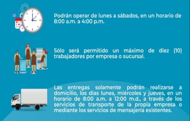 El tercer artículo establece que las actividades en los literales B, C, D y E deberá ajustarse a los siguientes parámetos: solo podrán operar de lunes a viernes en un horario de 8:00 a.m. a 6:00 p.m. y solo será permitido un máximo de 10 trabajadores por empresa o sucursal.