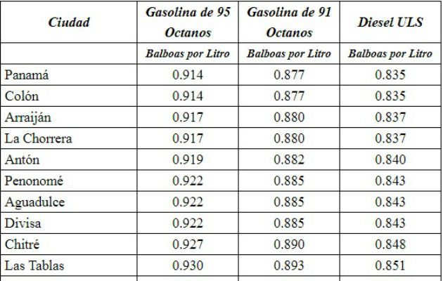 Los precios para las provincias de Panamá y Colón el litro de gasolina de 95 octanos costará $0.914 (+0.032); de 91 octanos $0.877 (+0.029).; y el diésel $0.835 (+0.037), según la Secretaría Nacional de Energía (SNE).