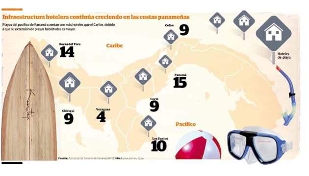 Actualmente en la costa del Pacífico panameño se contabilizan unos 45 hoteles de playa, mientras que en la orilla del Atlántico las opciones se reducen a 23, según cifras de la Autoridad de Turismo de Panamá (ATP).