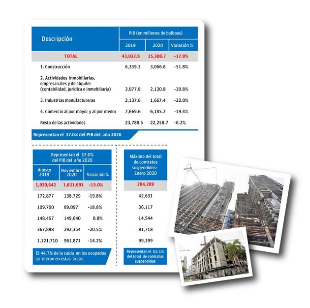 La actividad más afectada fue la construcción cuyo PIB cayó de 6 mil 359 millones de dólares en 2019 a 3 mil 66 millones de dólares (51.8%).