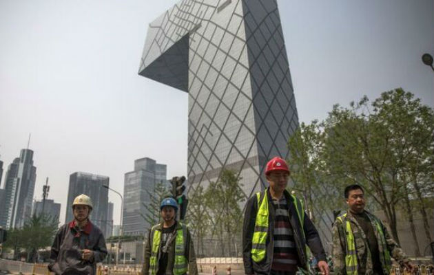 Trabajadores caminan por el distrito financiero de Pekín, en China, cuya economía siguió desacelerándose en el tercer trimestre. EFE