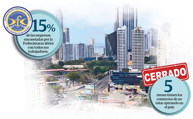 Una encuesta de la Federación de Cámaras de Comercio de la República de Panamá (Fedecamaras) reveló que sólo el 15% de las empresas encuestadas abrirá con todos sus trabajadores; el 47% reabrirá con menos trabajadores, y el 37% se reinventará.
