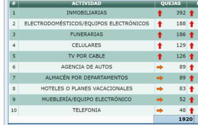 Por actividades, el mayor número de quejas resueltas por la Acodeco y que fueron favorables a los consumidores, fueron: inmobiliarias, 392 por $22,625,938.00; electrodomésticos y equipos electrónicos, 188 por $105, 571.00; funerarias 186 por $18,639.00; ventas de celulares, 129 quejas por $33,571.00.