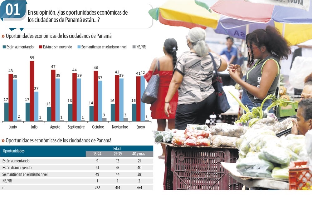 El 83 % de los consultados percibe que las oportunidades económicas de los ciudadanos en Panamá están disminuyendo, o se mantienen en el mismo nivel. Esta percepción se mantuvo en un nivel similar durante el último trimestre del año, luego de un repunte durante el mes de agosto del año pasado.