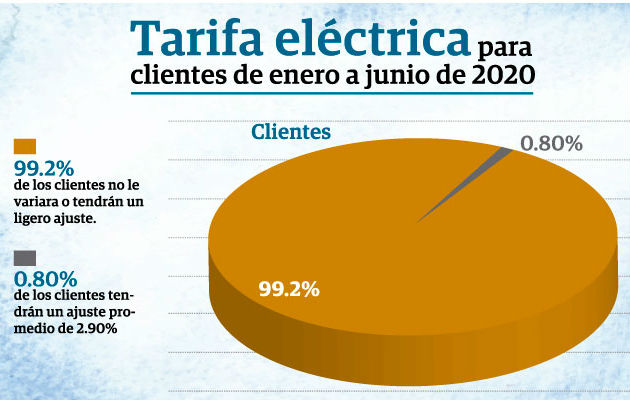 Para el primer semestre del 2020, el 99.2% de la población no registrará un aumento en la tarifa eléctrica, lo que corresponde a un total de un millón 135 mil 936 de los clientes a quienes no les variará su factura o tendrán un ligero ajuste de un 1%.