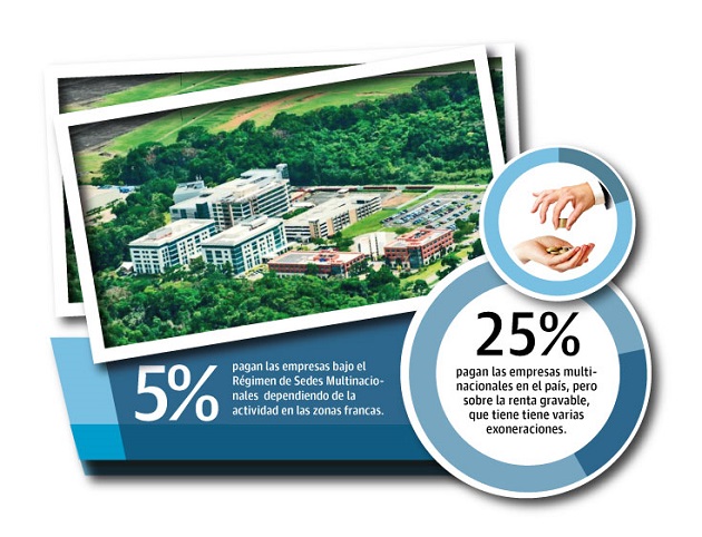 Actualmente en el país las empresas multinacionales pagan un 25%, pero sobre la renta gravable, que tiene tienen varias exoneraciones. Mientras que las empresas bajo el régimen de Sedes Multinacionales pagan 5%, dependiendo de la actividad en las zonas francas y las que se encuentran en Panamá Pacífico pagan entre 0% a 5%.