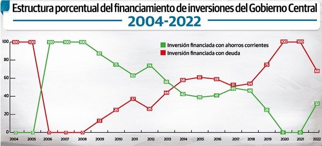 En el 2019, el ahorro corriente del Gobierno Central fue el más bajo en los últimos 13 años con $930 millones, cuando en el 2018 fue de $1,745 millones, en el 2017 ($1,877 millones) y en el 2016 ($1,543 millones), por ejemplo. En ese mismo año, la inversión pública del Gobierno Central fue la más baja (5.5%) desde el 2008 cuando registró (5.1%). Mientras que, en el 2020 y 2021 la inversión pública financiada se ejecutó al 100% con deuda cuando lo ideal es que entre el 67% a 70% de las inversiones se financien con ahorrro y de 33% a 30% con deuda.
