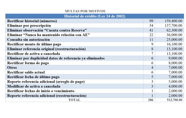 Entre las acciones o motivos más frecuentes de quejas están: Rectificar el historial (número) con 99 multas, lo que representó $159,400, seguido del no eliminar por prescripción con 54 multas por un monto de $137,700; el no eliminar observación "cuenta contra reserva" con 41 multas que equivalen a $62,300; el no elimina "Nunca ha mantenido relación con AE" con 22 por $36,000 y la consulta son autorización con 11 multa para unos $25,000 en sanciones.