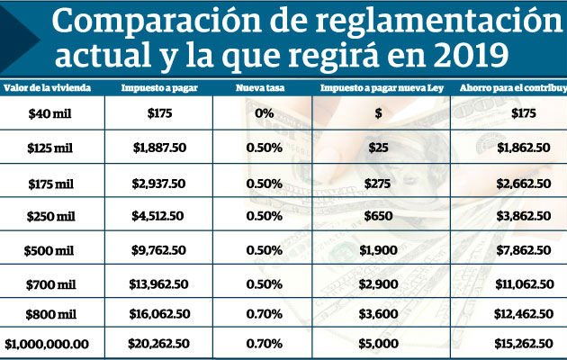 Con la nueva ley, que empieza a regir a partir de 2019, una propiedad valorada en $125 mil tendrá que pagar $25, ahorrándose así unos $1,862.50. Mientras, una vivienda, cuyo costo sea de $800 mil declarada como patrimonio familiar tributario (PFT) que actualmente paga $16 mil, en impuestos a partir de 2019 pagará $3,600 en impuestos, es decir, el contribuyente se ahorrará unos $12,462.50.