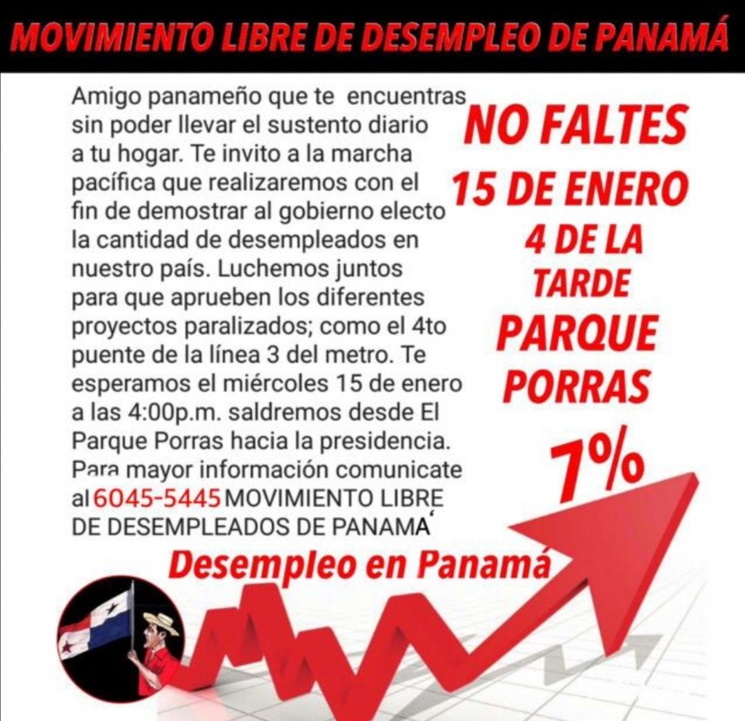 Los desempleados que saldrán a las 4:00 pm este 15 de enero de 2020 desde el Parque Porras hacia la Presidencia piden al Gobierno Nacional que se aprueben los diferentes proyectos paralizados como el Cuarto Puente de la línea 3 del Metro y otros.