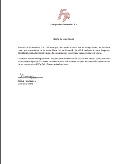 Franquicias Panameñas, S.A. informó que, de común acuerdo con el franquiciador, decidió cesar sus operaciones de la marca Pizza Hut en Panamá.