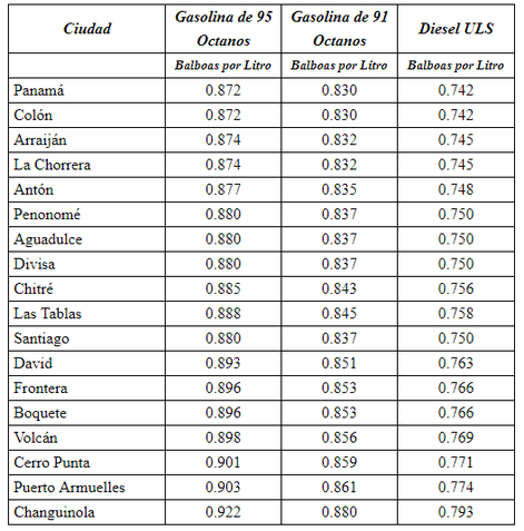 Para Panamá y Colón el precio del litro de gasolina de 95 octanos será de $0.872, la gasolina de 91 octanos costará $.0.830 y el litro del diésel costará $0.742.