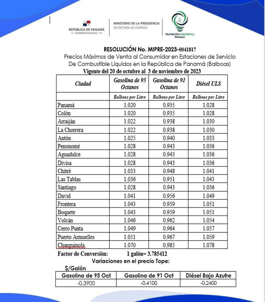 En Panamá los precios máximos de venta se actualizan cada 14 días calendario en función de las variaciones que experimenten los precios de paridad de importación respectivos y de la estimación de los costos de fletes y márgenes razonables de comercialización para cada combustible.