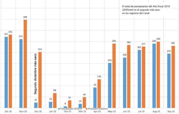De acuerdo con los registros del Canal de Panamá, la altura de precipitación en la Cuenca del Canal en el año fiscal 2019, entre el 1 de octubre de 2018 y el 30 de septiembre de 2019, alcanzó 2035 milímetros; solo superada por la registrada en el año fiscal 2015, que fue de 2027 milímetros.