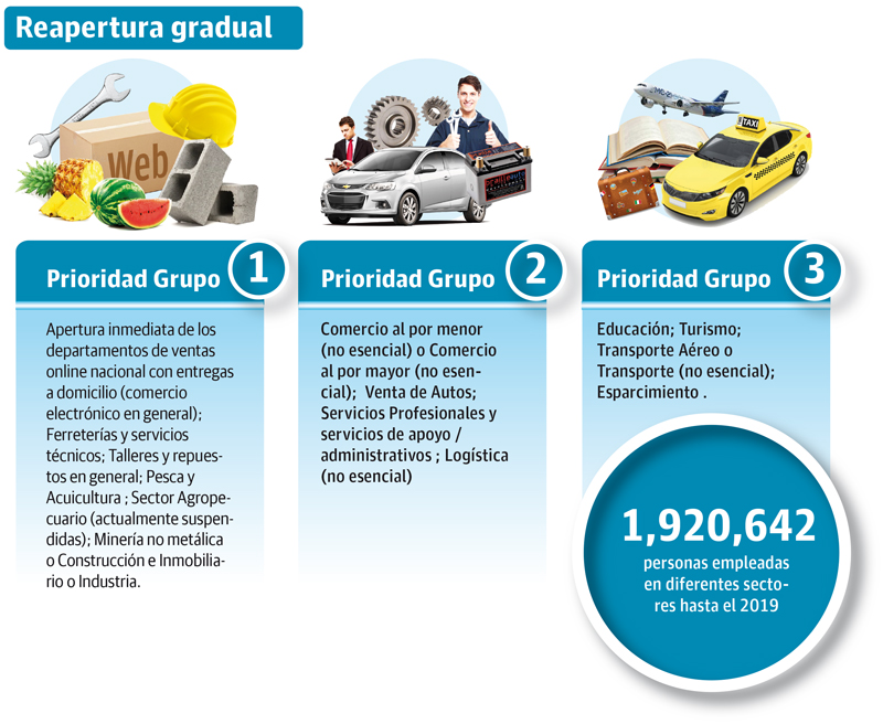 A pesar de que el Gobierno no ha anunciado una fecha exacta para iniciar la reactivación económica en el país ya se contempla un protocolo donde esta tarea se llevaría a cabo de manera escalonada en 3 grupos, según la actividad económica.