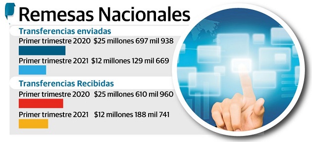 Cifras de la Dirección de Empresas Financieras del Ministerio de Comercio e Industria (Mici) revelan que en el primer trimestre 2021 las remesas nacionales enviadas y recibidas cayeron un 50% al registrar $12 millones 188 mil 741 y $12 millones 129 mil 669, respectivamente en comparación al mismo periodo de 2020 cuando se reportó la suma de $25 millones 610 mil 960 y 25 millones 697 mil 938.