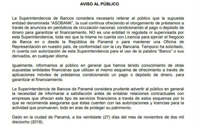 "Asobank" no es una entidad ni regulada ni supervisada, toda vez que tampoco ha solicitado una cuenta con autorización para el uso de la palabra “banco”, informó la Superintendencia de Bancos de Panamá.