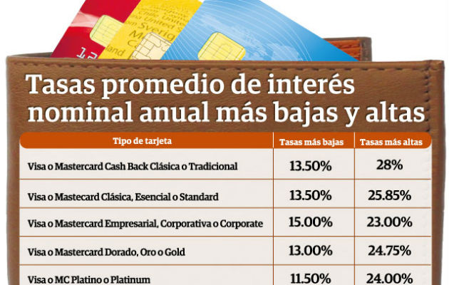 Para las Visa o Mastercard clásica, esencial o standar la tasa más baja es 13.50% y la más alta 25.85% y para aquellas Visa o Mastercard empresarial, Corporativa o Corporate oscilan entre 15.00% y 23.00%.