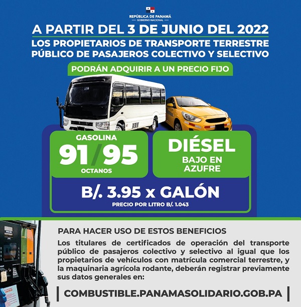 Para acceder a las medidas temporales aplicadas por el Órgano Ejecutivo ante las alzas en los precios de los combustibles, los dueños de certificados de operación de transporte público de pasajeros y los propietarios de vehículos con matrícula comercial terrestre y maquinaria agrícola rodante deberán registrarse en la página web combustible.panamasolidario.gob.pa