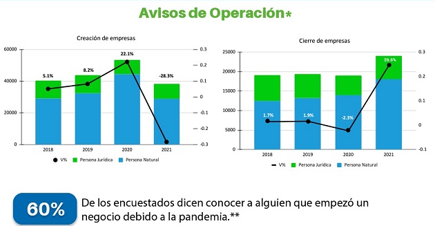 El informe también reveló que la principal razón para el cierre de negocios fue la pandemia y que la figura de "persona natural" constituye el mayor porcentaje de avisos de operación.