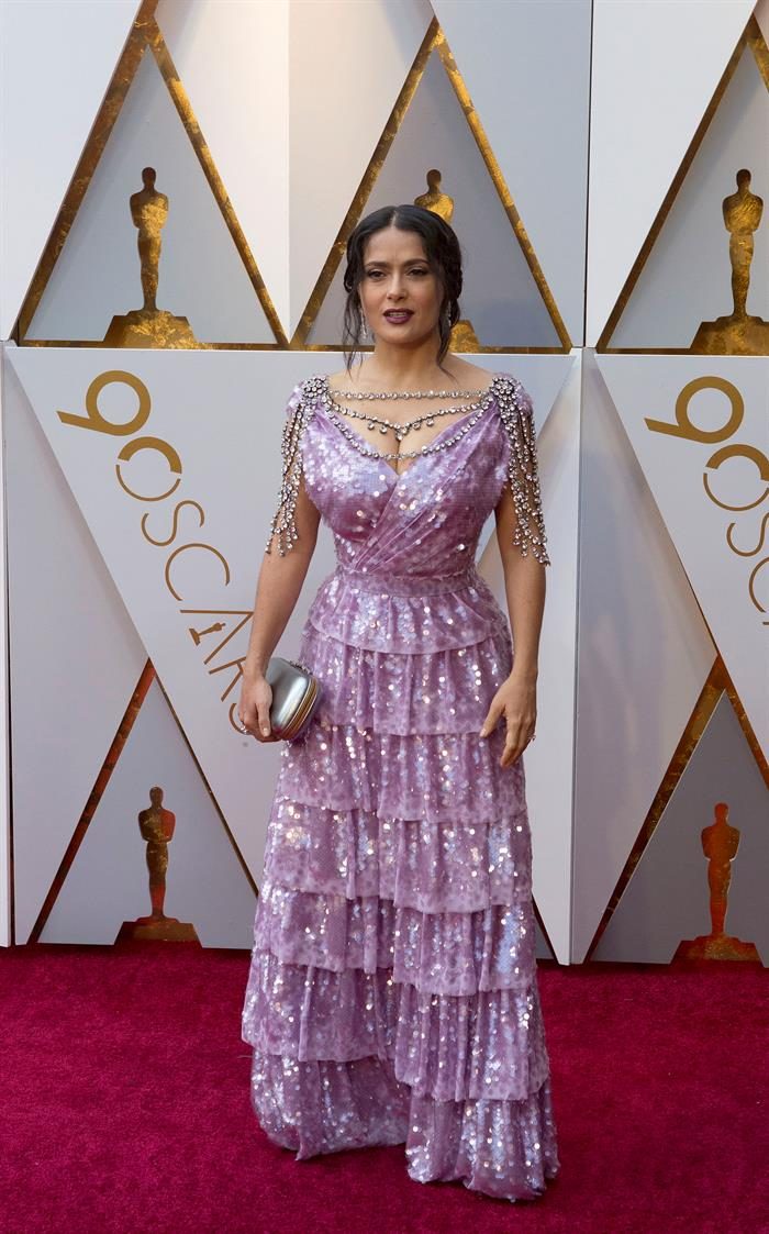 Mientras Jane Fonda decoró con la pequeña chapa grabada con "Time's Up" su Balmain, blanco impoluto, con hombreras y escote cuadrado puntiagudo; Salma Hayek, una de las voces más sonadas del movimiento contra los abusos de género en la industria tras contar su desagradable experiencia con el productor Harvey Weinstein, se dejó la chapa en casa.
