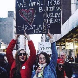Las dos modelos estaban en la calle ... Bella sosteniendo un letrero que decía: "Todos somos humanos", como Gigi cantó, "No hay odio, no hay miedo, los inmigrantes son bienvenidos aquí."