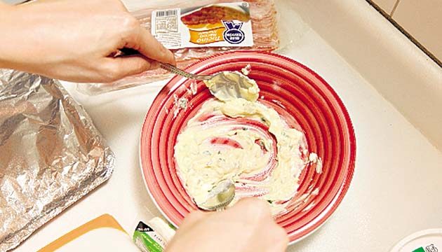 En un tazón colocar los quesos y las nueces pecanas y mezclar bien hasta formar una masa homogénea.