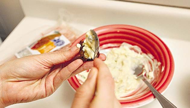 Con la ayuda de un cuchillo pequeño, abrir los dátiles por la mitad a lo largo sin cortar del todo. Rellenar cada uno con la mezcla de queso y nueces.