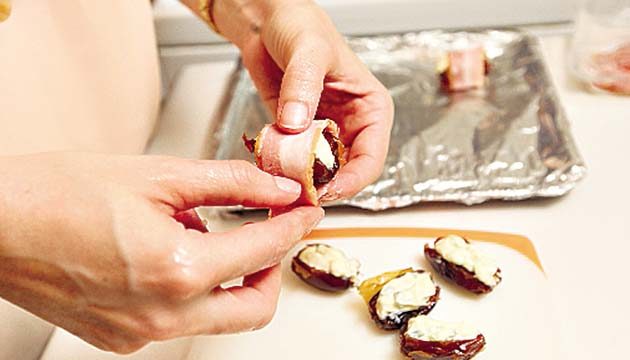 Cortar las tiras de tocino a la mitad y envolver cada dátil con una de estas, asegurar con la ayuda de un palillo.