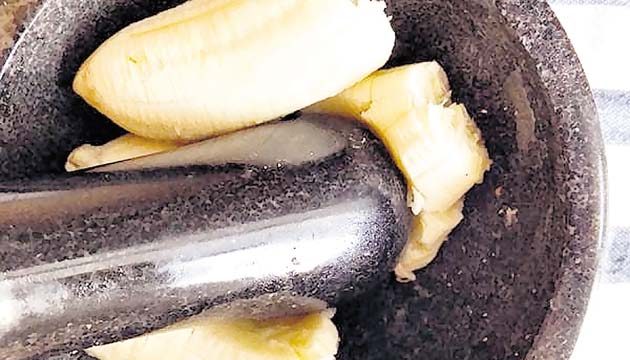 Para preparar este tradicional bizcocho de guineo, coge un recipiente y aplasta las bananas con un tenedor o un mortero hasta que queden bien trituradas. Una vez estén bien triturados...