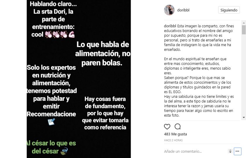 "Hablando claro.. La srita Dori, la parte entrenamiento: cool", "Lo que habla de alimentación, no paren bolas", "Hay cosas fuera de fundamento, por lo que hay que evitar tomarla como referencia", entre otras frases decía la imagen. Según la entrenadora de BBL Bootcamp, compartió el 'post' con fines educativos y con el respeto del seguidor, cortó el nombre, ya que no es personal.