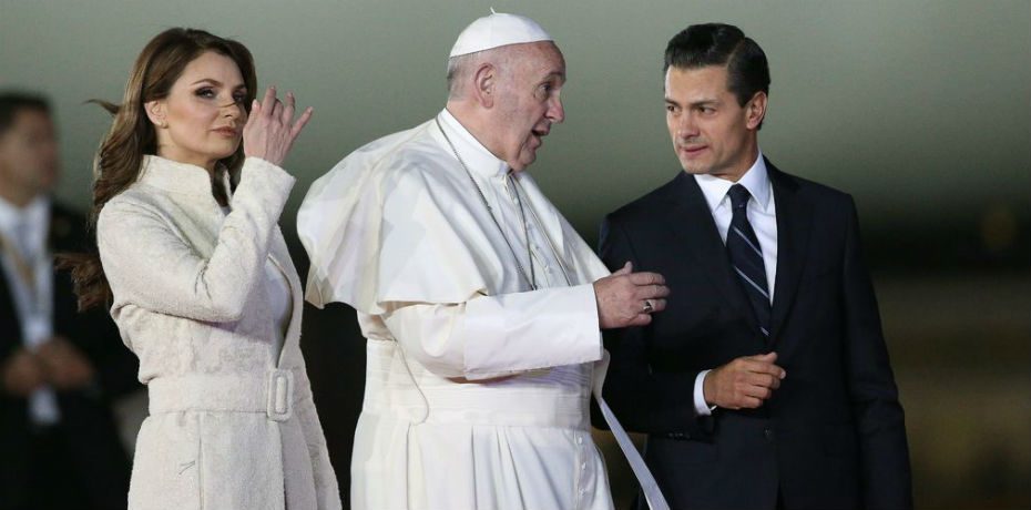 La esposa del presidente Enrique Peña Nieto eligió un conjunto color perla del diseñador mexicano Benito Santos para dar la bienvenida del pontífice en el Aeropuerto Internacional de la Ciudad de México.