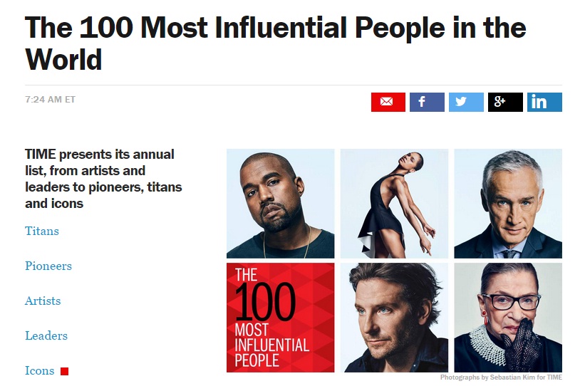 El papa Francisco y el presidente cubano, Raúl Castro, comparten los honores con personajes de la farándula como Kim Kardashian en la lista de las "cien personas más influyentes" que dio a conocer hoy la revista Time. La revista dividió la lista en cinco grupos (titanes, pioneros, artistas, líderes e iconos), con sus perfiles escritos por distintas personalidades del mundo al que pertenecen. En la de líderes está incluido Castro junto a otros jefes de Estado o de Gobierno como el norcoreano Kim Jong Un, la alemana Angela Merkel y el estadounidense Barack Obama, o el periodista mexicano Jorge Ramos. Entre los titanes comparten honores, entre otros, la presidenta de la Reserva Federal de Estados Unidos, Janet Yellen, y la reina de la farándula Kim Kardashian, y entre los iconos figuran el papa Francisco y la artista islandesa Bj rk. En un artículo de la escritora Rachel Kushne para esta edición de Time, Castro es catalogado como un "evolucionario" y destaca que ha tomado pasos innovadores para normalizar las relaciones con EE.UU. y buscar el final del embargo económico que sufre la isla. El nobel de la paz Desmond Tutu, al retratar al papa, dice que "empacó su pastorado de humildad y se lo llevó a Roma", y asegura que sus puntos de vista de no juzgar en asuntos muy polémicos para la Iglesia católica, como la orientación sexual y el divorcio, han traído esperanzas a millones de católicos. El primer ministro de Grecia, Alexis Tsipras, cuyo perfil está a cargo del dirigente izquierdista español Pablo Iglesias, es descrito como "una estrella creciente" que se convirtió "en la esperanza de un pueblo que enfrenta el desastroso efecto de políticas de austeridad que han sido impuestas en su país". Obama no solo figura en la lista de la revista Time como integrante del apartado de líderes, sino que también se encarga de escribir el perfil del primer ministro de India, Narendra Mori. Entre los integrantes de la lista está también la activista guatemalteca Aura Elena Farfán, fundadora de la ONG FAMDEGUA, que ayuda a familias en la búsqueda de parientes desaparecidos, como ocurrió con su hermano en 1984. El artículo destaca que la valentía de Farfán ha tenido resultados: algunos de los exsoldados que cometieron la masacre en la villa de Las Dos Erres en 1982, y que ella ha estado investigando por años, están presos.