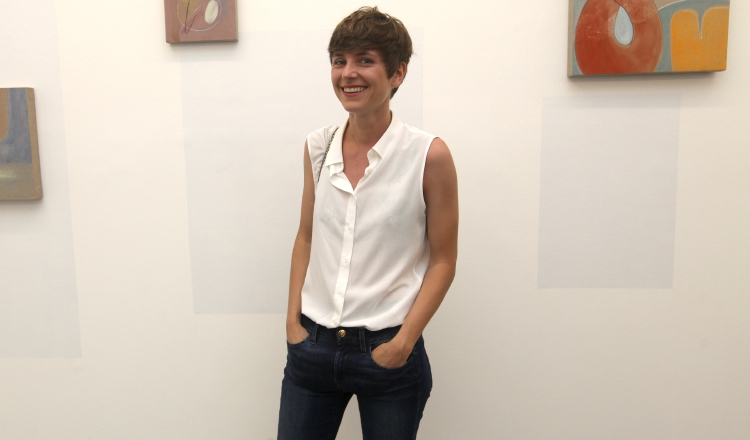 Elsa Louise- Manceaux junto a algunos de los trabajos de esta individual, en Diablo Rosso, Casco antiguo. Aurelio Herrera Suira.