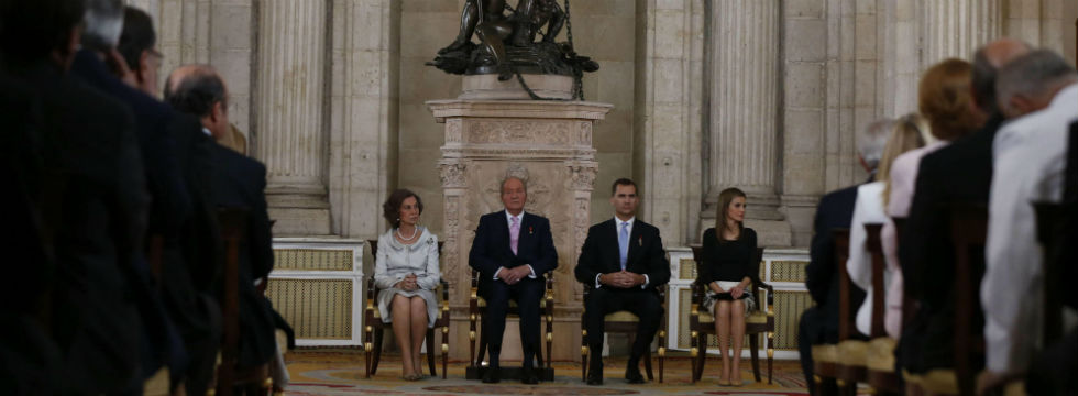 El Rey Juan Carlos recibió el aplauso de la Reina Sofía, el Príncipe de Asturias, Felipe de Borbón, y la Princesa Letizia, tras firmar esta tarde la ley orgánica que hará efectiva a medianoche su abdicación, en una solemne ceremonia celebrada en el Salón de Columnas del Palacio Real.