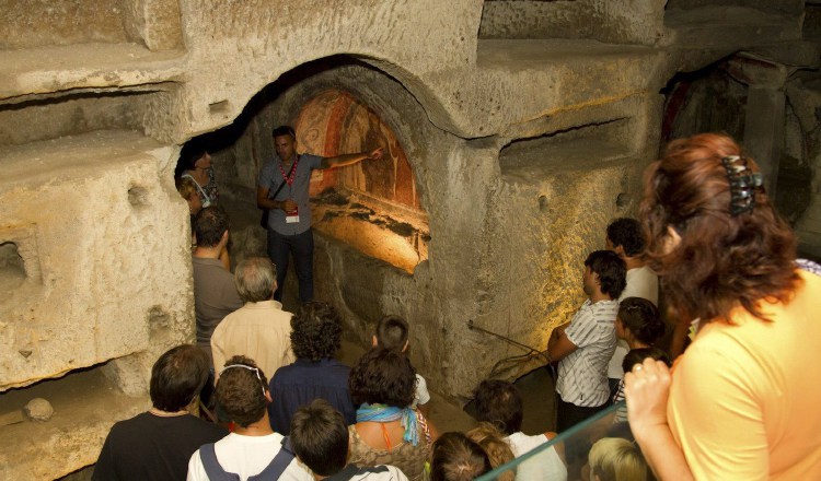 Unos turistas admirando las catacumbas de Nápoles. Foto: EFE