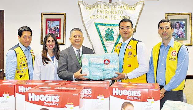 El Club Activo 20-30 entregó 15,200 unidades de pañales desechables al Hospital del Niño para contribuir con el bienestar de los menores de este centro. En la foto: Ramón Policart, Club Activo 20-30; Jacqueline Levy de Policart; Dr. Paul Gallardo, director del Hospital del Niño; Mario Cornejo, presidente del Comité Organizador de la Gran Recolecta de Pañales 20-30 y Orlando Herrera, Club Activo 20-30.