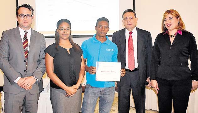 En el marco del Convenio de Cooperación entre la Universidad Interamericana de Panamá y la Fundación Cali Canto otorgaron una beca honorífica a Marcos Casazola para cursar estudios de Lic. en Marítima y Portuaria de la UIP. En la foto: Matt Harbison – director ejecutivo UIP, Dalys Rodríguez – directora ejecutiva Fundación Cali Canto, Marcos A. Casazola M. – becario honorífico, Stanley Muschett – rector UIP y Eyda Ramos – Responsabilidad Social UIP.