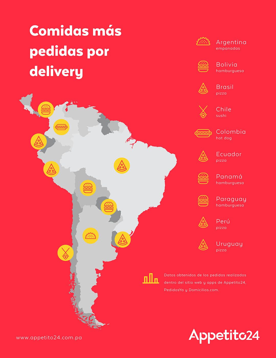 Nuestra pasión por las hamburguesas se comparte con Bolivia y Paraguay, donde también resulta el plato más pedido a domicilio. Chile por su parte elije al sushi como preferido, quizás por su muy buena pesca de salmón. Argentina por último, es el único país donde las tradiciones tiran y las empanadas son el plato más pedido.
