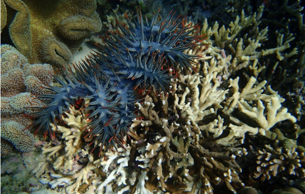 Esta estrella es la corona de espinas o acantáster púrpura (Acanthaster planci), "uno de los pocos animales que pueden comer corales", en los que basa su dieta.