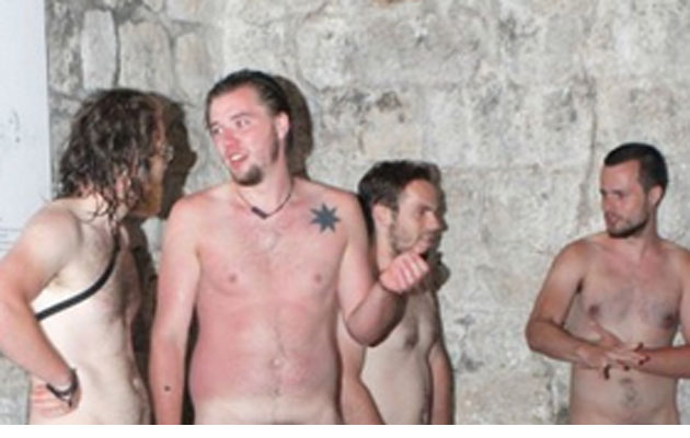 El periodista del diario de Montenegro, Vijesti, comienza el relato sobre los alemanes que hicieron su propia carrera ... en cuero... por la ciudad turística de Dubrovnik con "todavía está repleto de eventos interesantes e inolvidables este verano". Primero hay que tomar en cuenta que hace 25 grados en Dubrovnic, Croacia, y que los alemanes no están acostumbrados al calor, ya que casi no ven sol en su país. Segundo, algunos testigos detallan que olían a alcohol. Eso dicho, cuatro chicos jóvenes, alemanes de paseo en la ciudad se encueraron y caminaron "con indiferencia" por las calles. Y el periódico tiene 1, 2, 3, 4... no... 13 fotos publicados de los cuatro en su página web. Alguien le avisó a la policía por dónde andaban los ¿delincuentes? y se toparon con ellos en una calle donde, claro, de pura suerte, está la catedral.